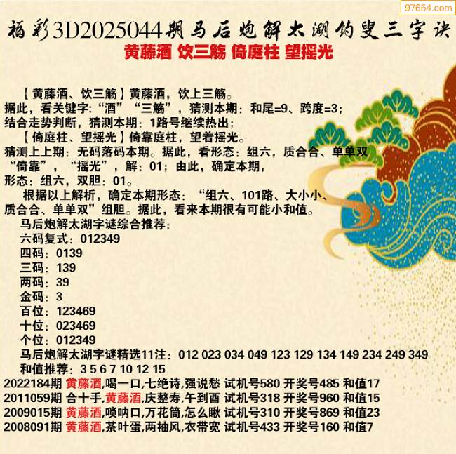 25年044期马后炮解3d太湖钓叟之 饮三觞