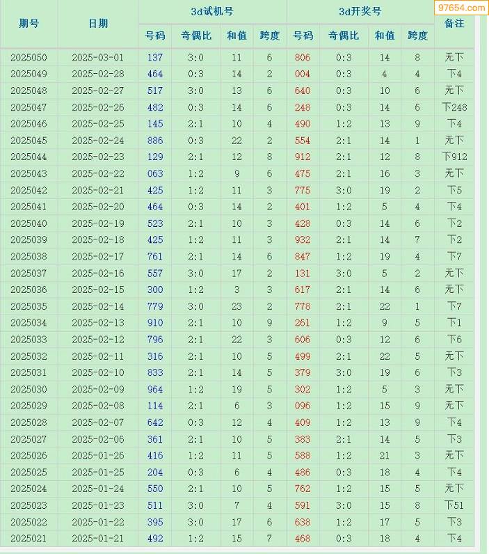 福彩3D试机号近50期历史记录(2025-03-02)