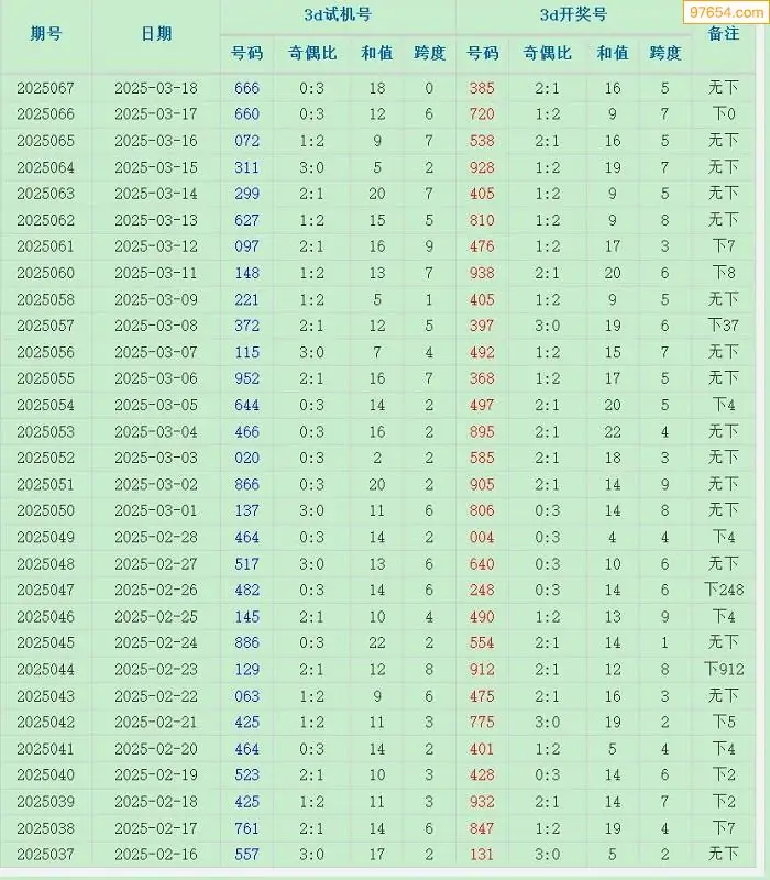 福彩3D试机号近50期历史记录(2025-03-19)