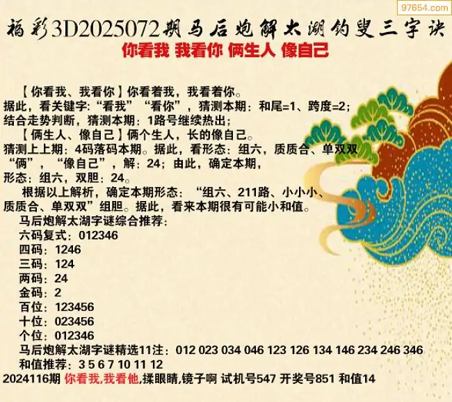 25年072期马后炮解3d太湖钓叟之 俩生人