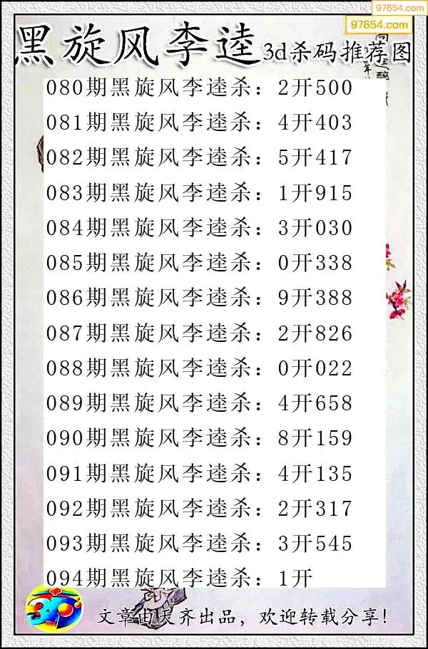 牛彩网345期福彩杀码图汇总 杀:97