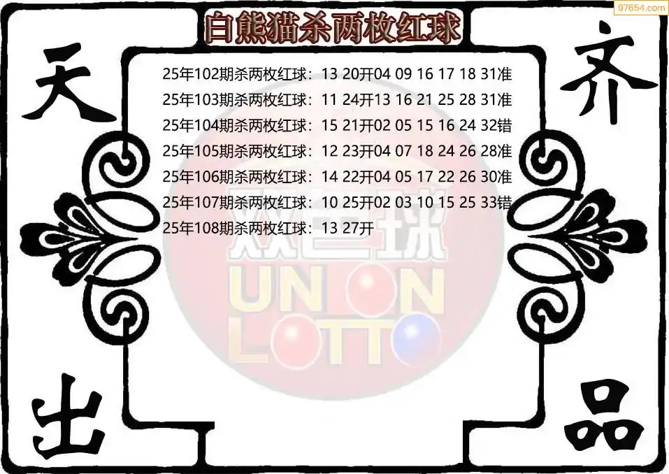 25年双色球108期白熊猫杀两枚红球图谜