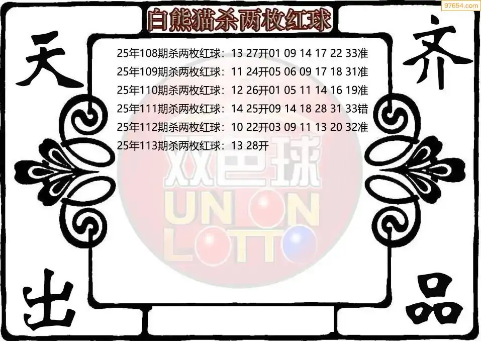 25年双色球113期白熊猫杀两枚红球图谜