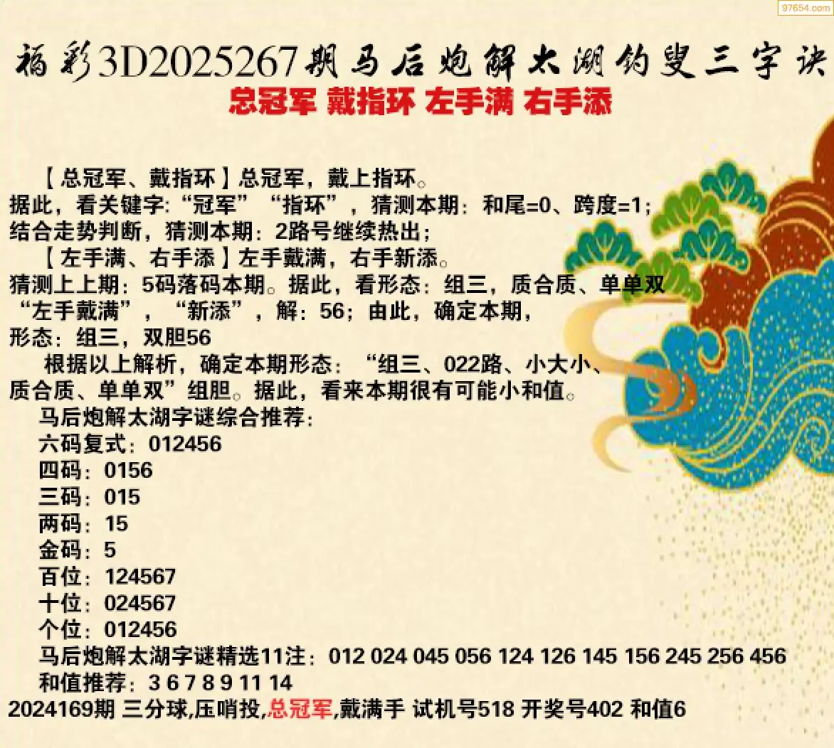 福彩3d25年267期东山省解太湖谜语