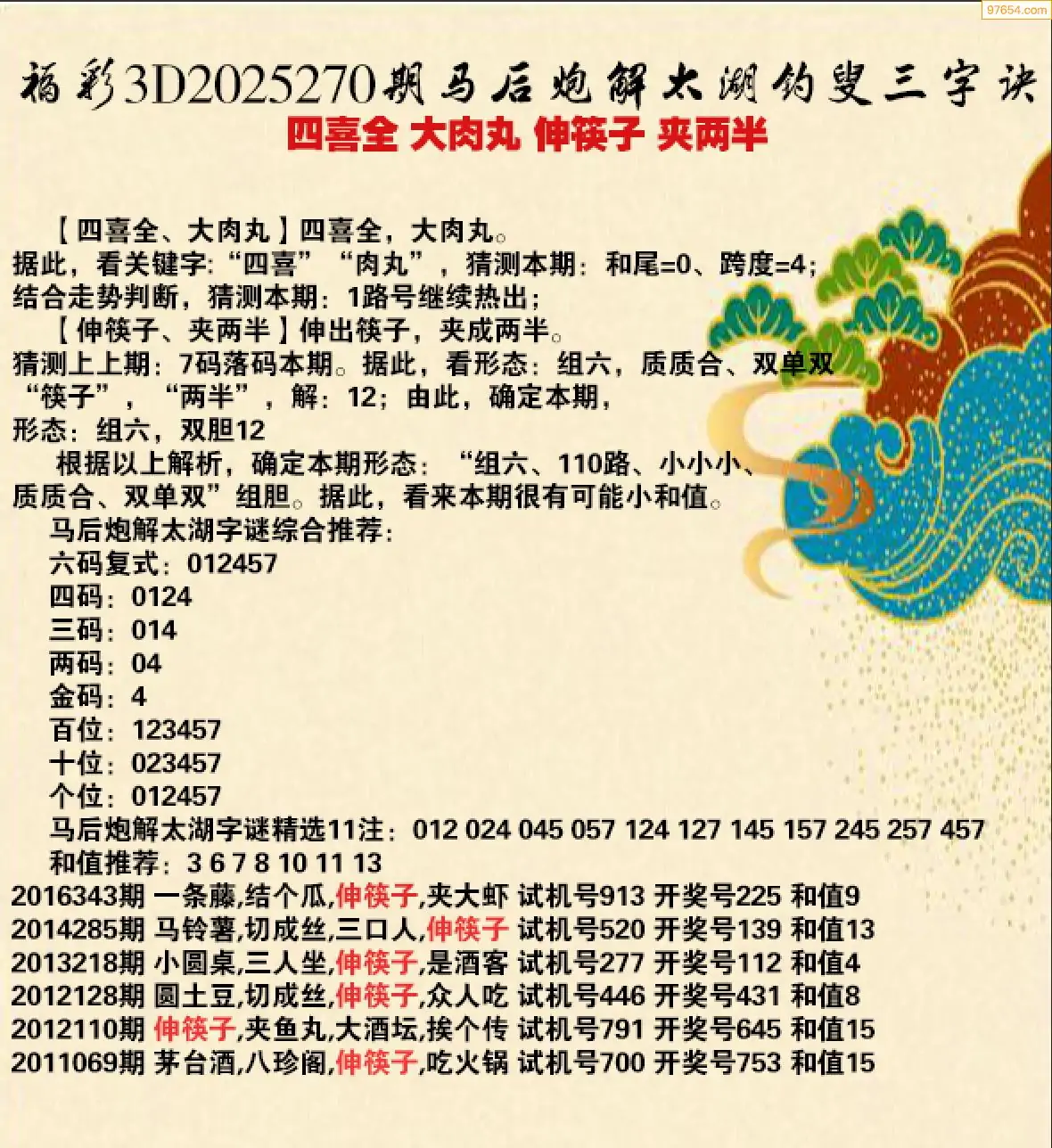 25年270期马后炮解3d太湖钓叟之 四喜全