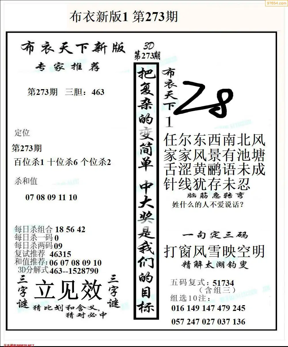 福彩273期3d真精华布衣+布衣早报(转载)
