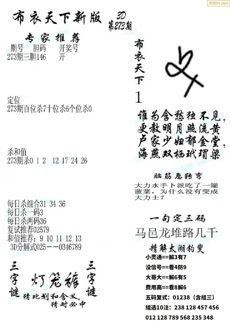 福彩273期3d真精华布衣+布衣早报(转载)