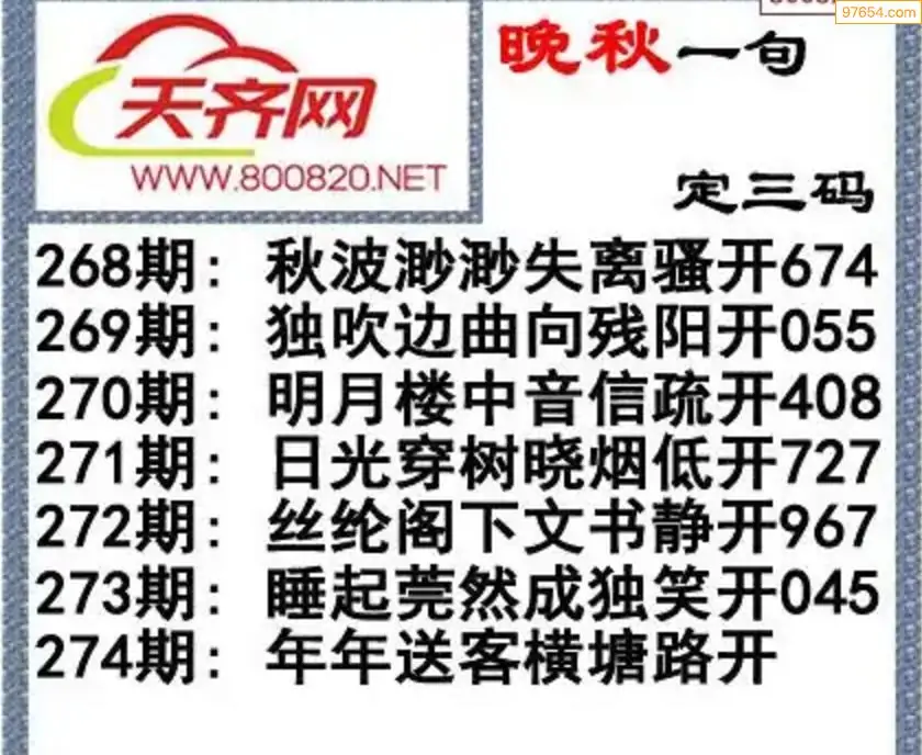274期3D晚秋(乙种和值)谜:日为两数 D:上游河尾