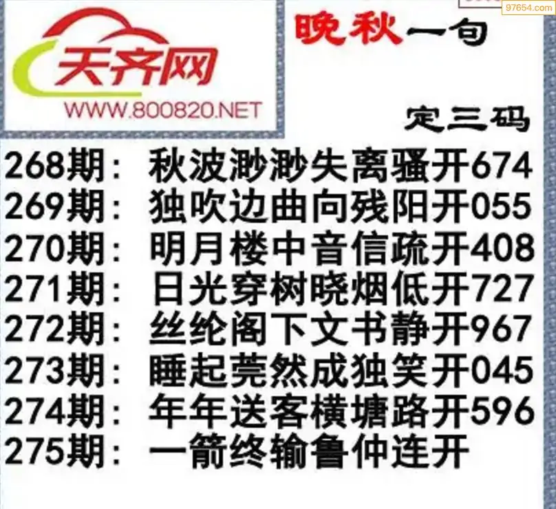 275期3d福彩今日晚秋字谜一句定三码