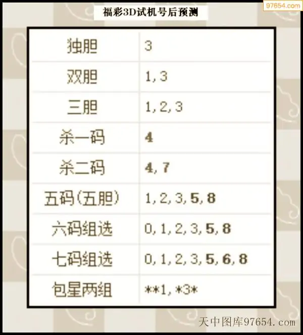 277期铜墙铁壁3D试机号预测