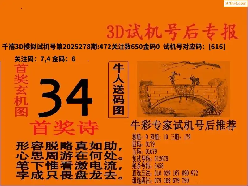 25278期福彩3D试机号后首奖诗