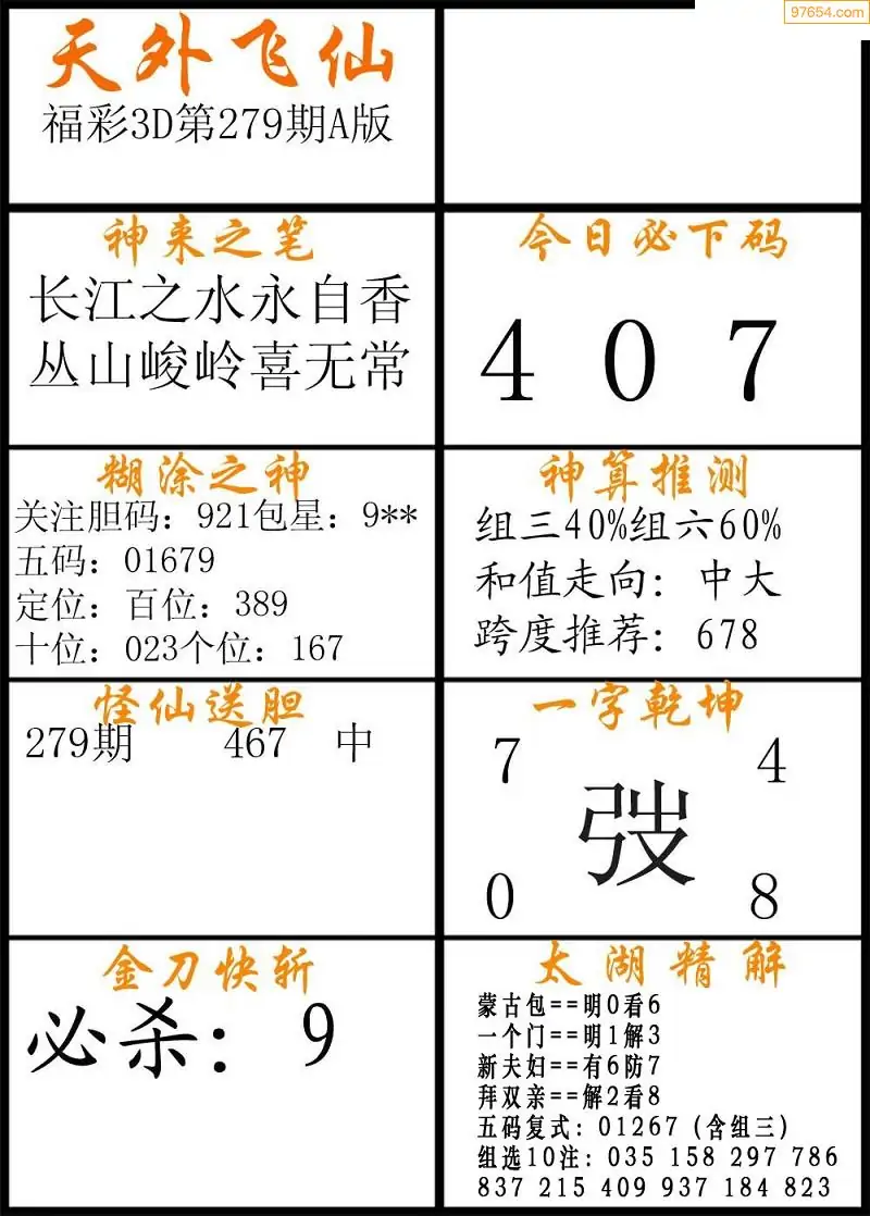 279期福彩3d天外飞仙A版