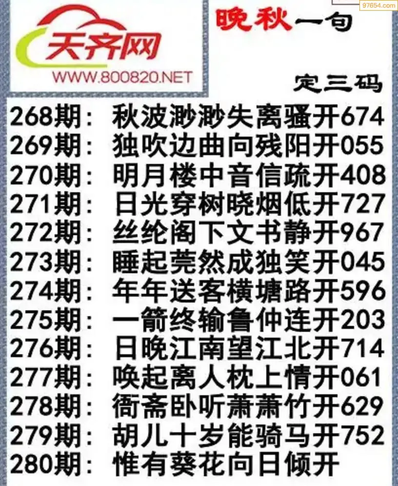 280期3d福彩今日晚秋字谜一句定三码