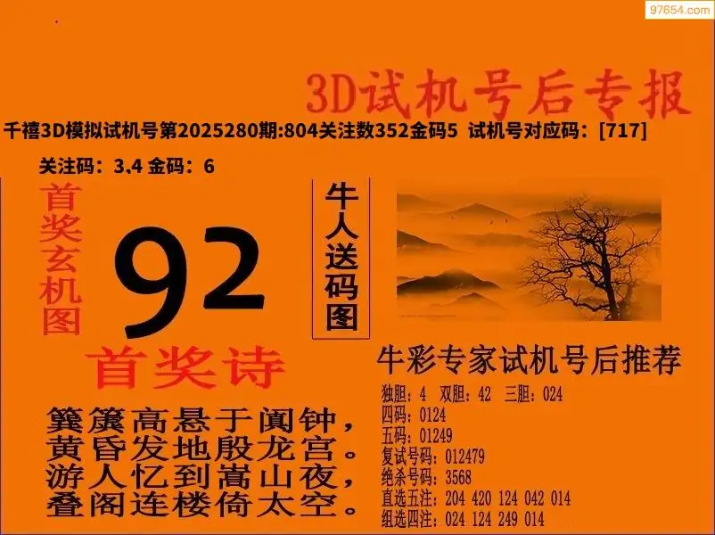 25280期福彩3D试机号后首奖诗