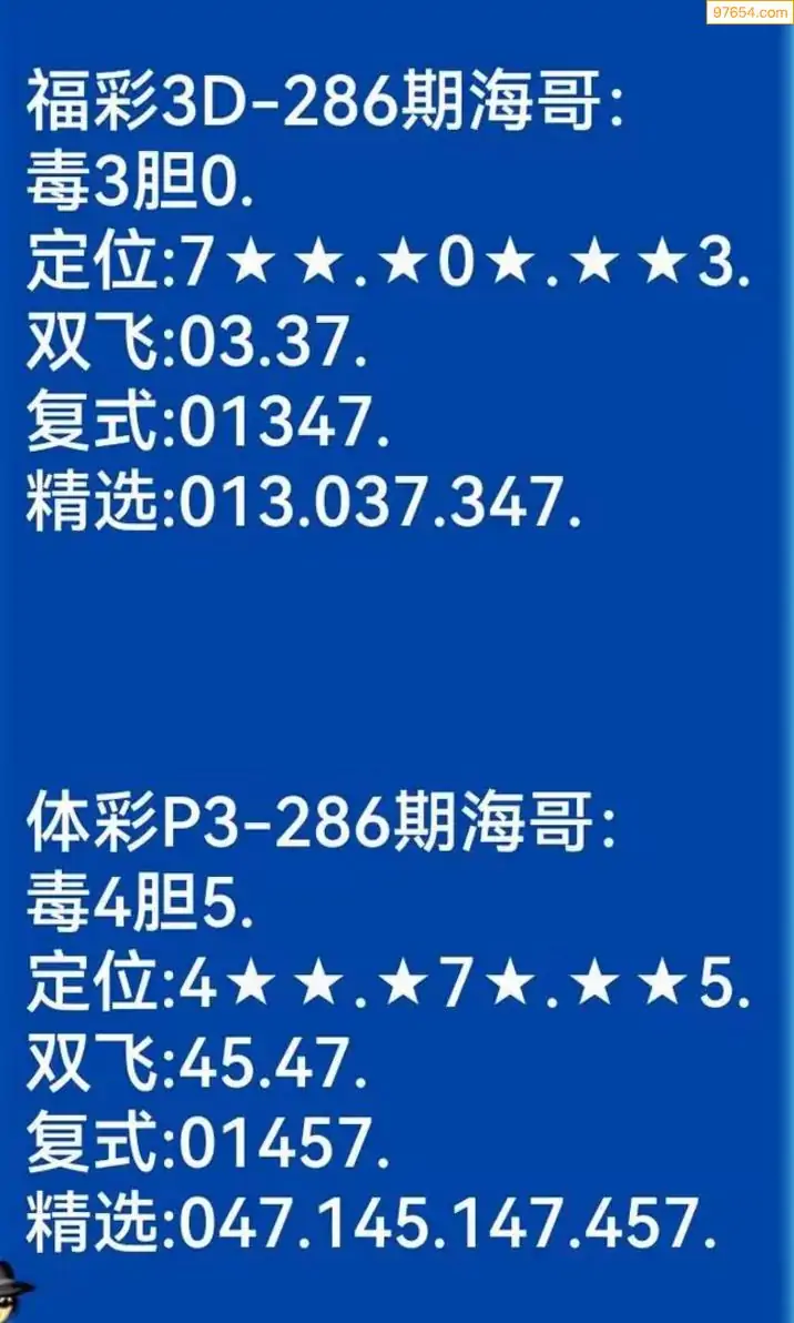 3D2025年285期彩神通双胆胆码推荐 6连中