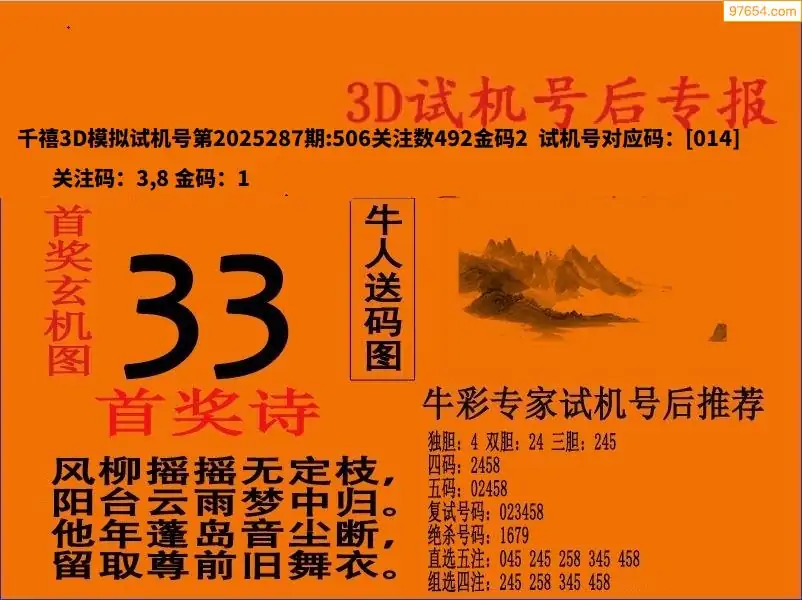 25287期福彩3D试机号后首奖诗