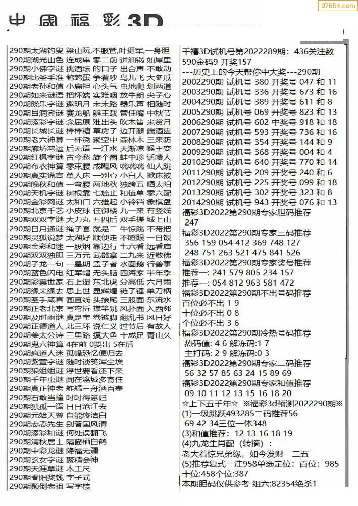 25290期福彩3D正版天宇和值谜