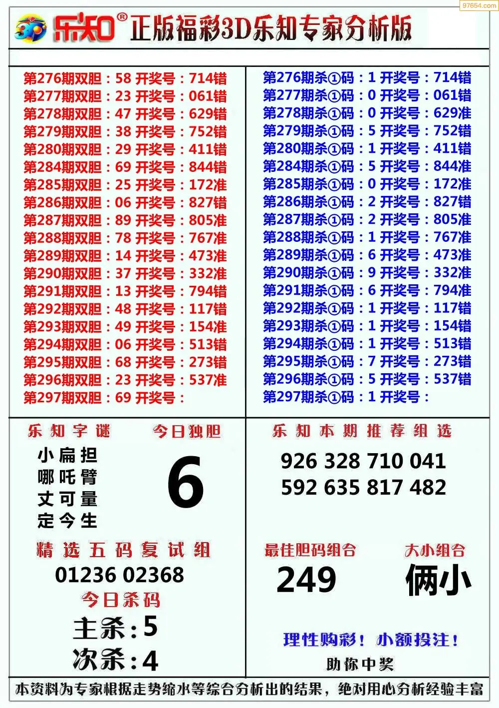 298期3D牛彩预测报+彩吧字谜报