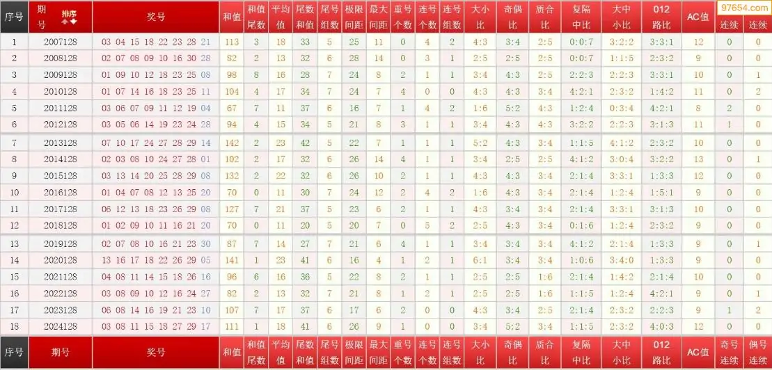128期七乐彩历史同期图表+走势图