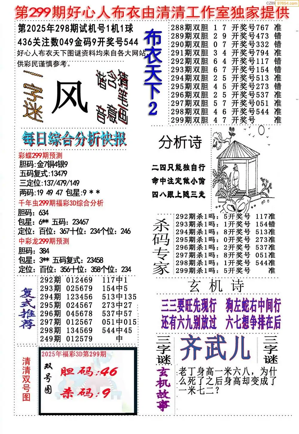 福彩25299期布衣3d字谜ab