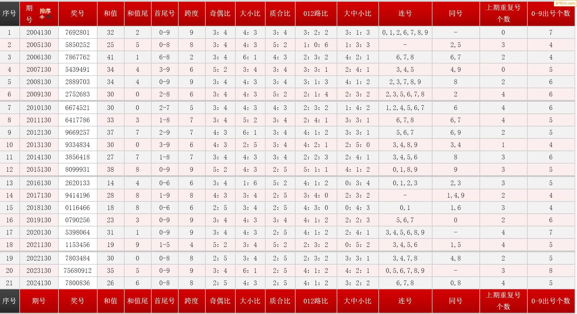 130期七星彩历史同期图表+走势图