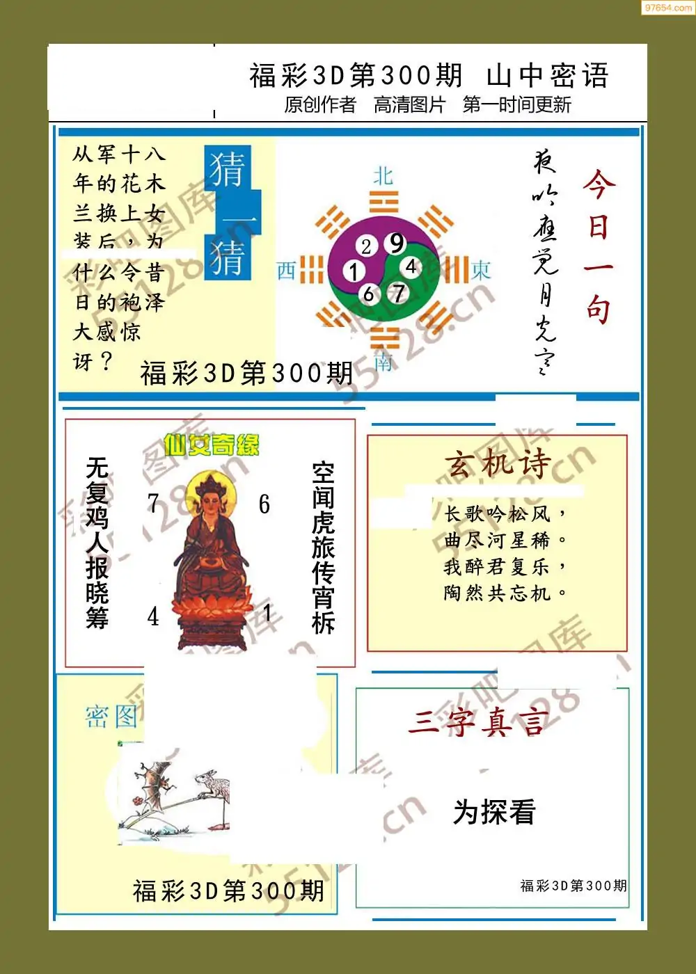 福彩3D25300期蓝仙子一句定三码图谜