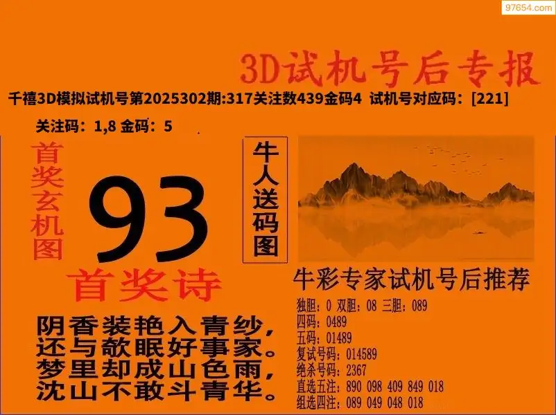 25302期福彩3D试机号后首奖诗