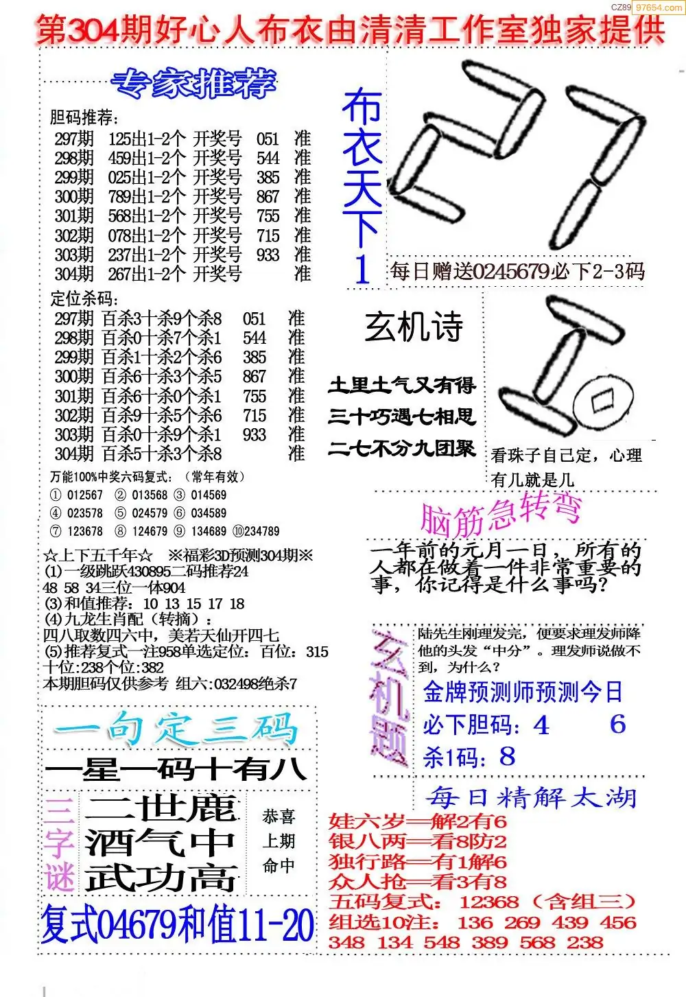 福彩304期3d真精华布衣+布衣早报(转载)