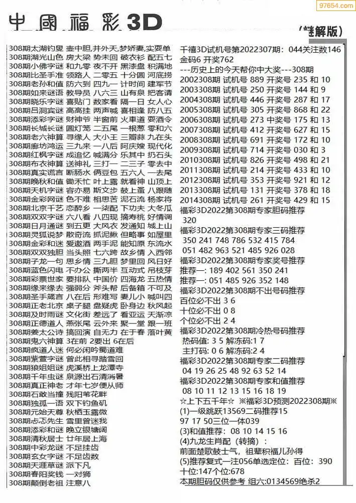 25308期福彩3D正版天宇和值谜