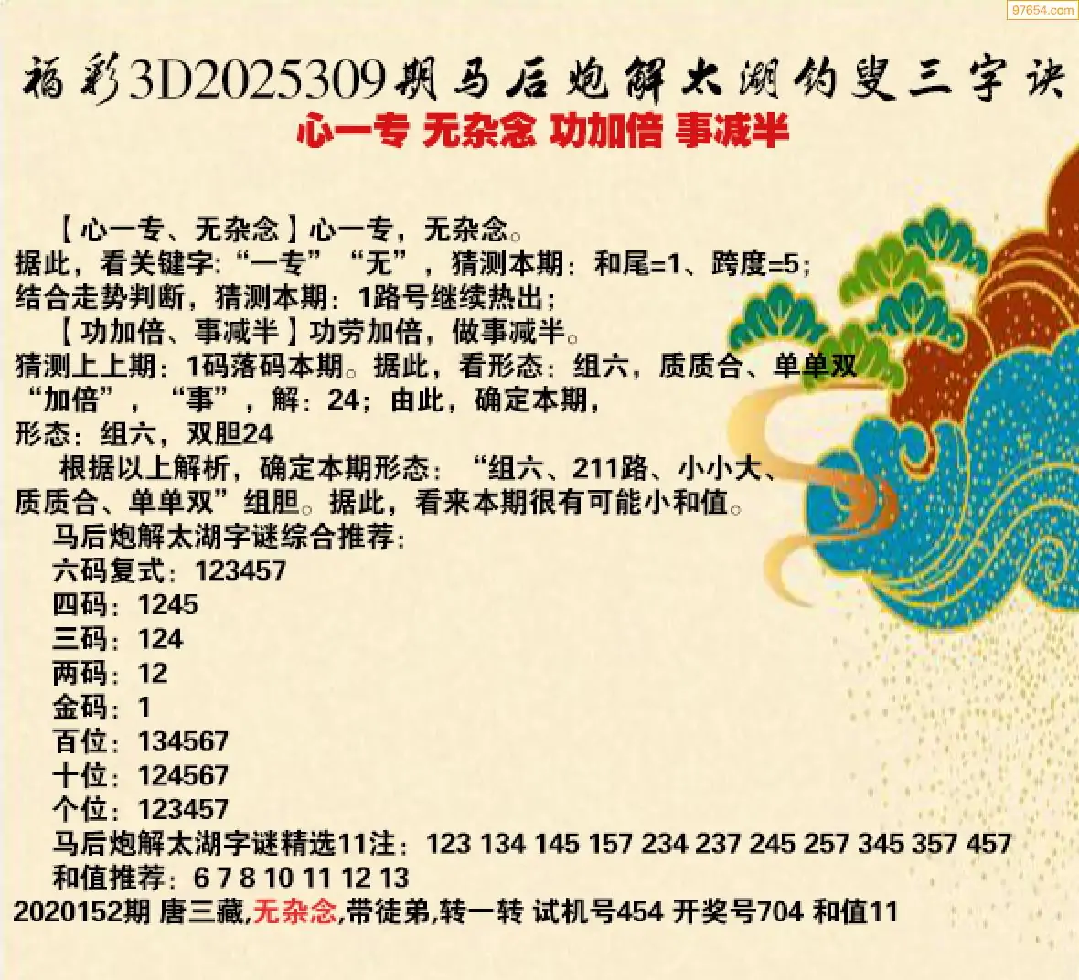 25年309期马后炮解3d太湖钓叟之 无杂念