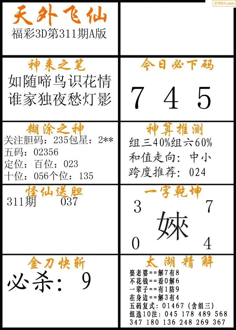 311期福彩3d天外飞仙A版