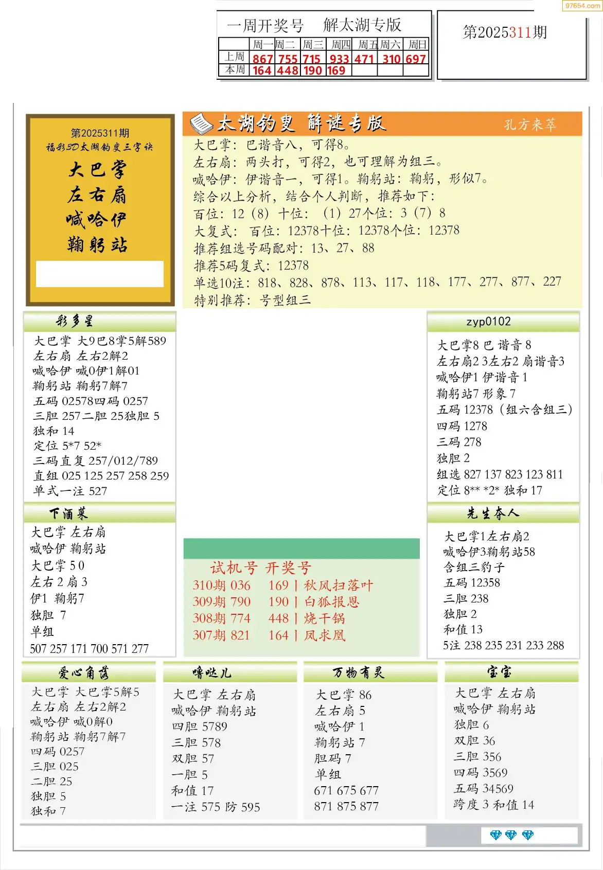 福彩3D311期天牛彩吧套图整合总汇