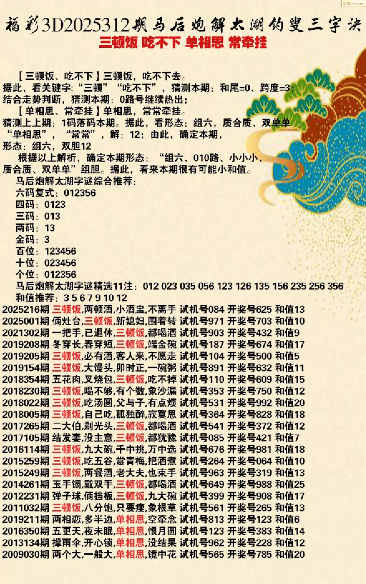 25312期福彩3d太湖钓叟三字诀历史汇总