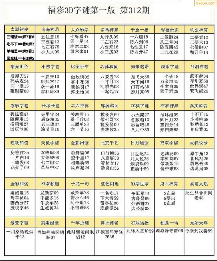 312期3D牛彩预测报+彩吧字谜报