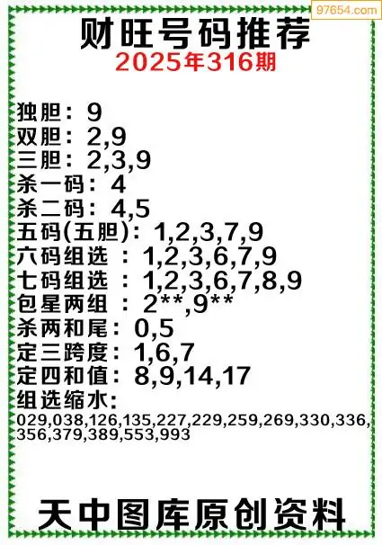 3D原创316期旺财出号推荐