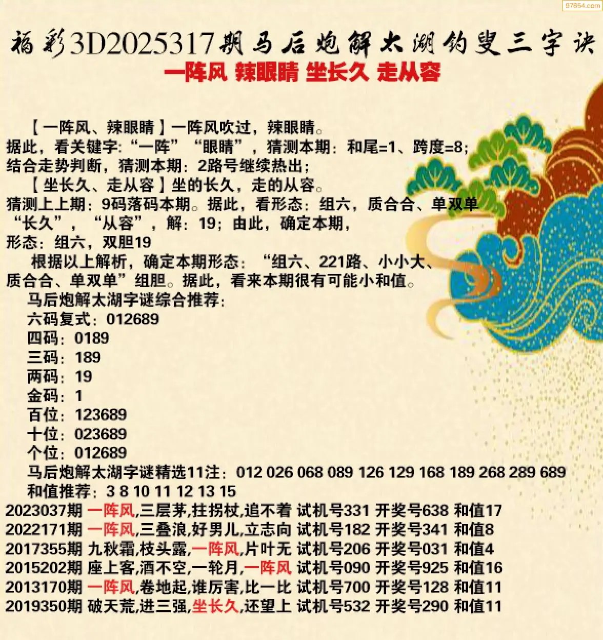 25年317期马后炮解3d太湖钓叟之 一阵风