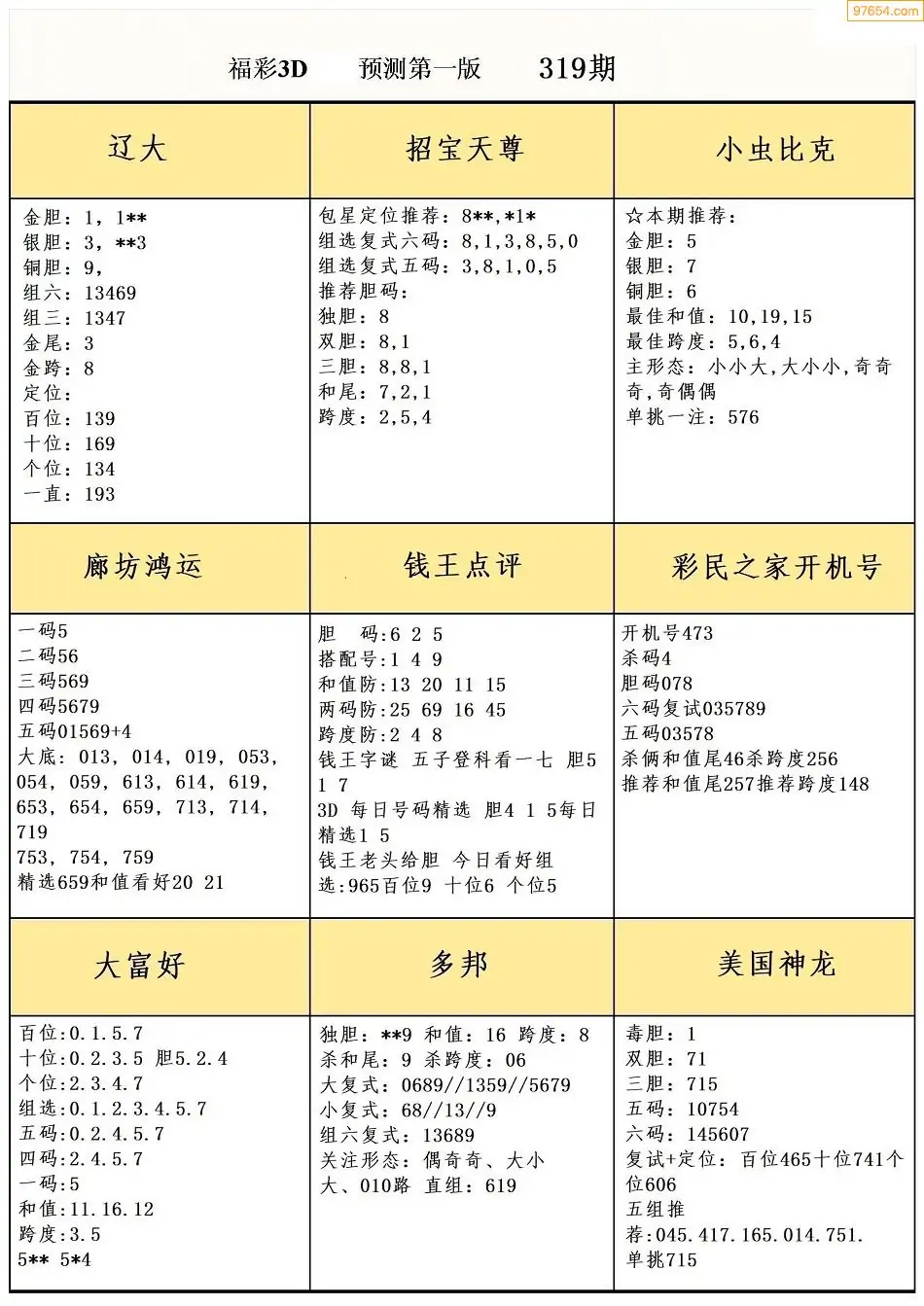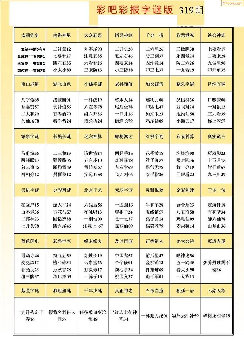 319期3D牛彩预测报+彩吧字谜报