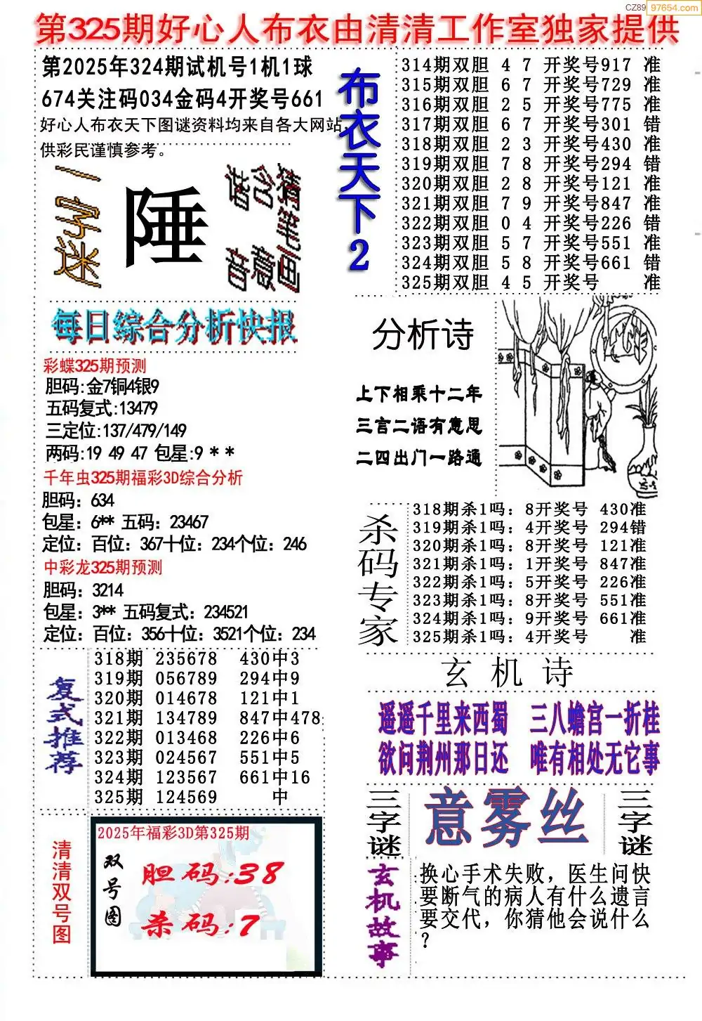 福彩325期3d真精华布衣+布衣早报(转载)