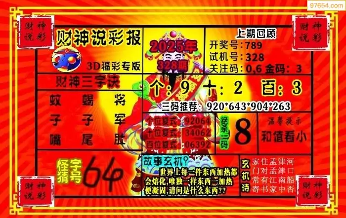 25328期福彩3D正版天宇和值谜