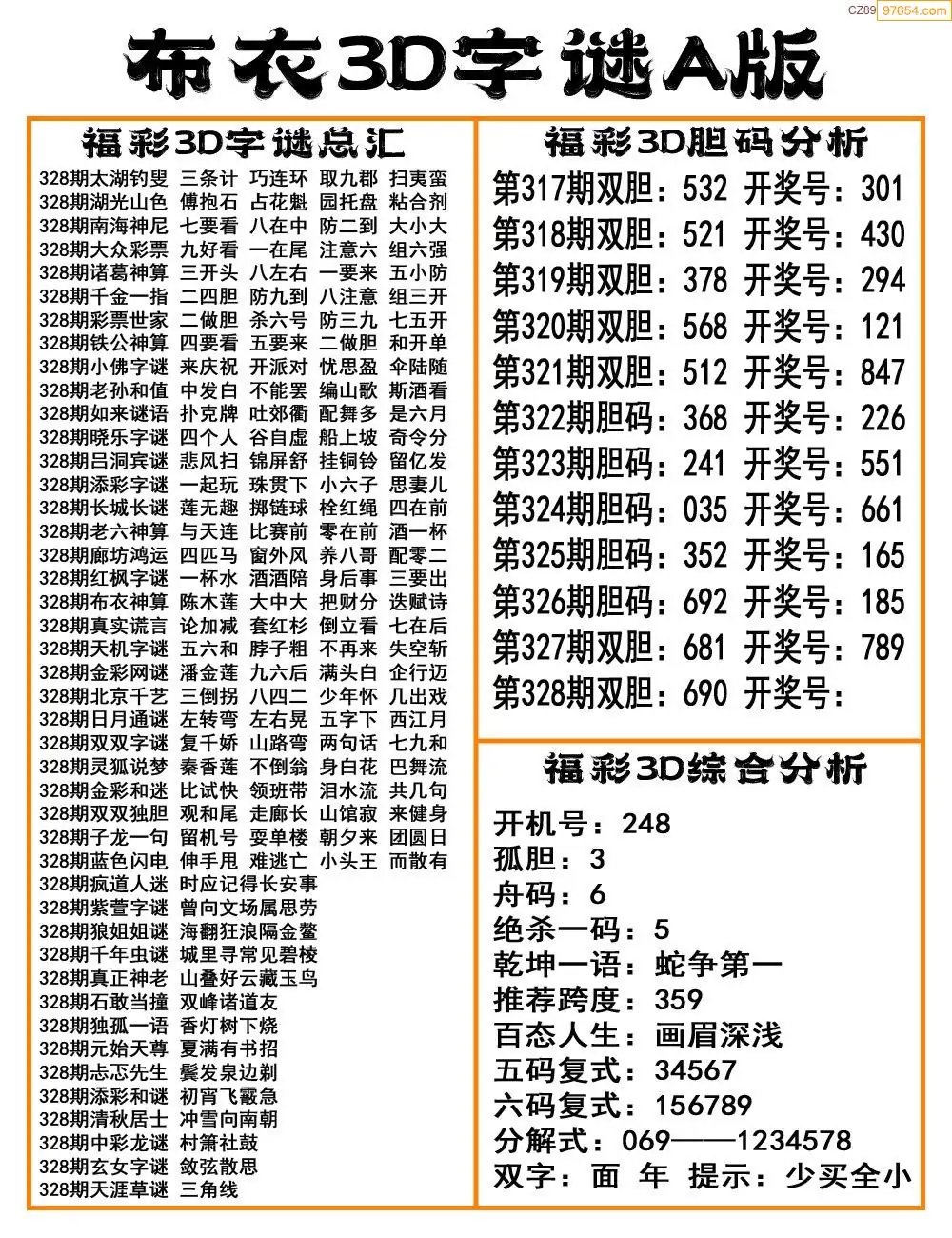 福彩25328期布衣3d字谜ab