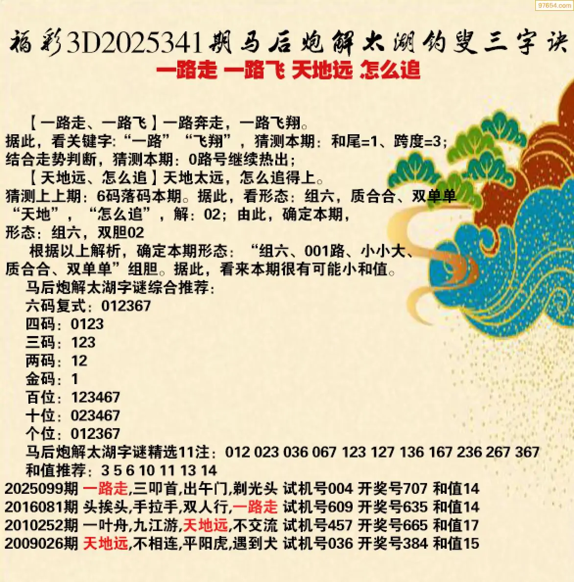 25年341期马后炮解3d太湖钓叟之 一路飞