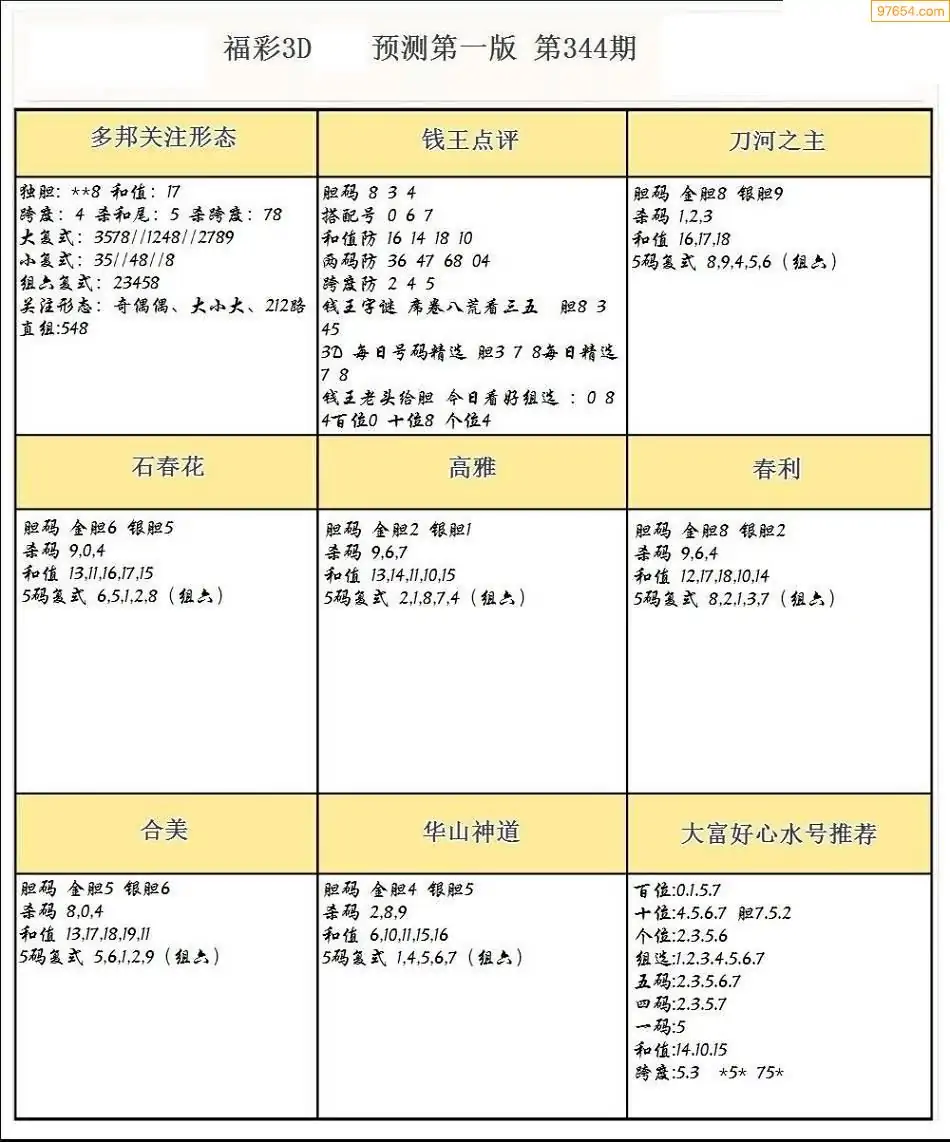 福彩3D344期天牛彩吧套图整合总汇