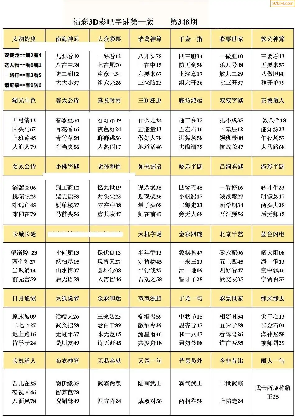 348期3D牛彩预测报+彩吧字谜报