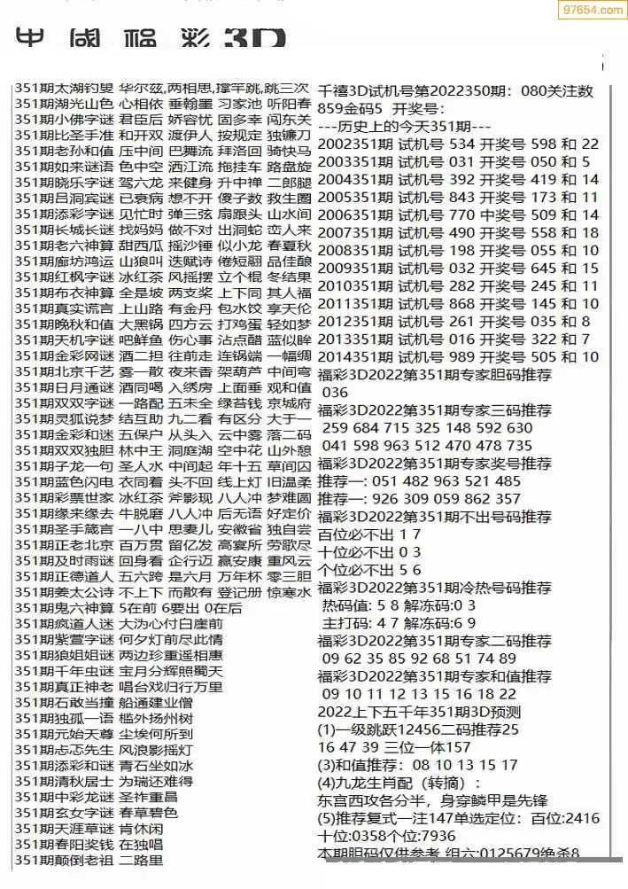 福彩3D351期天牛彩吧套图整合总汇