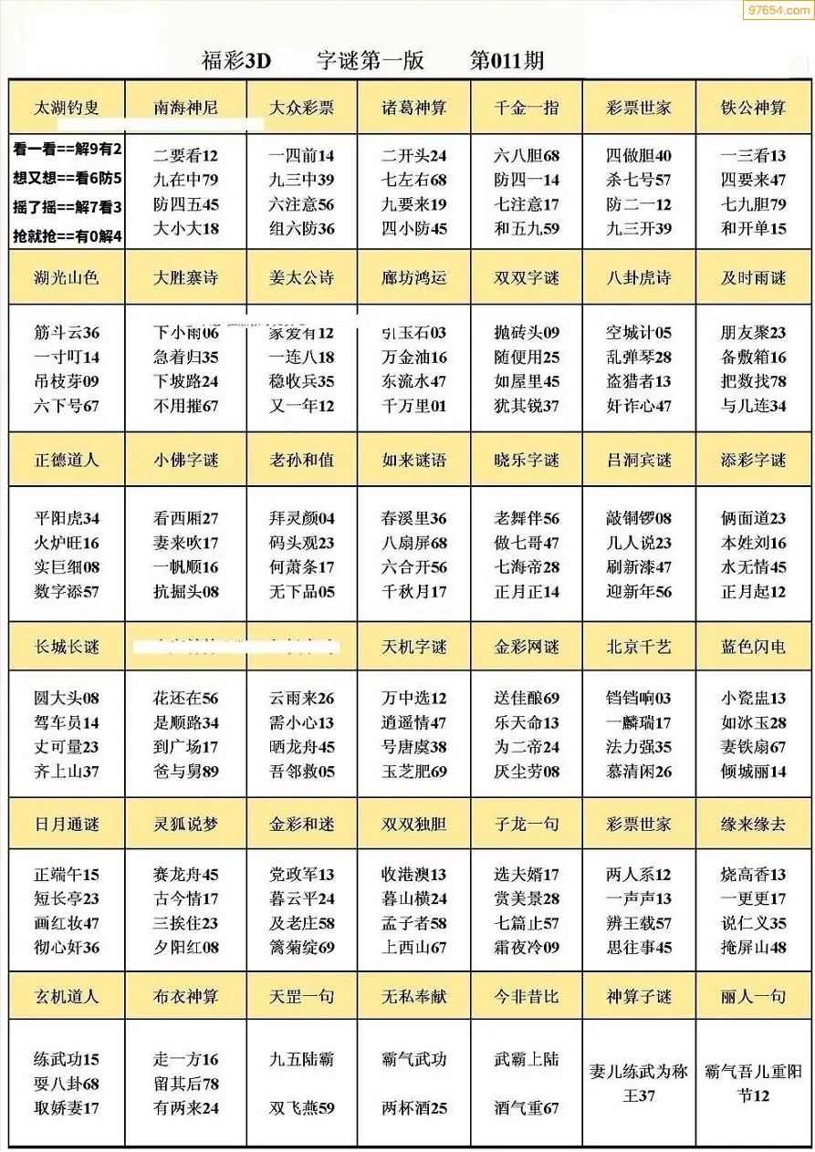 011期3D牛彩预测报+彩吧字谜报
