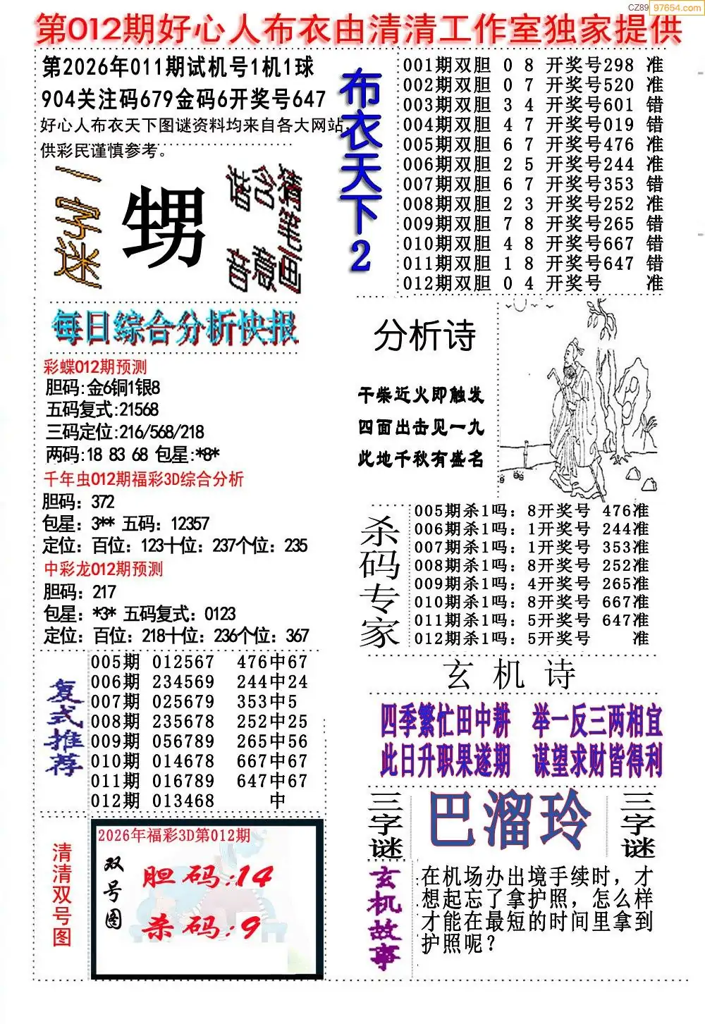 福彩26012期布衣3d字谜ab