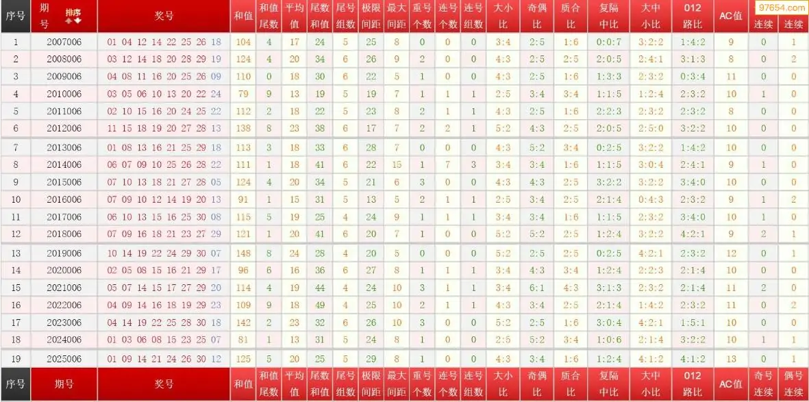 006期七乐彩历史同期图表+走势图