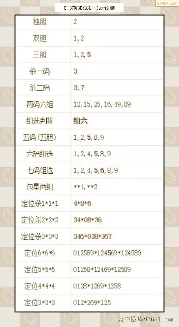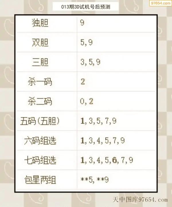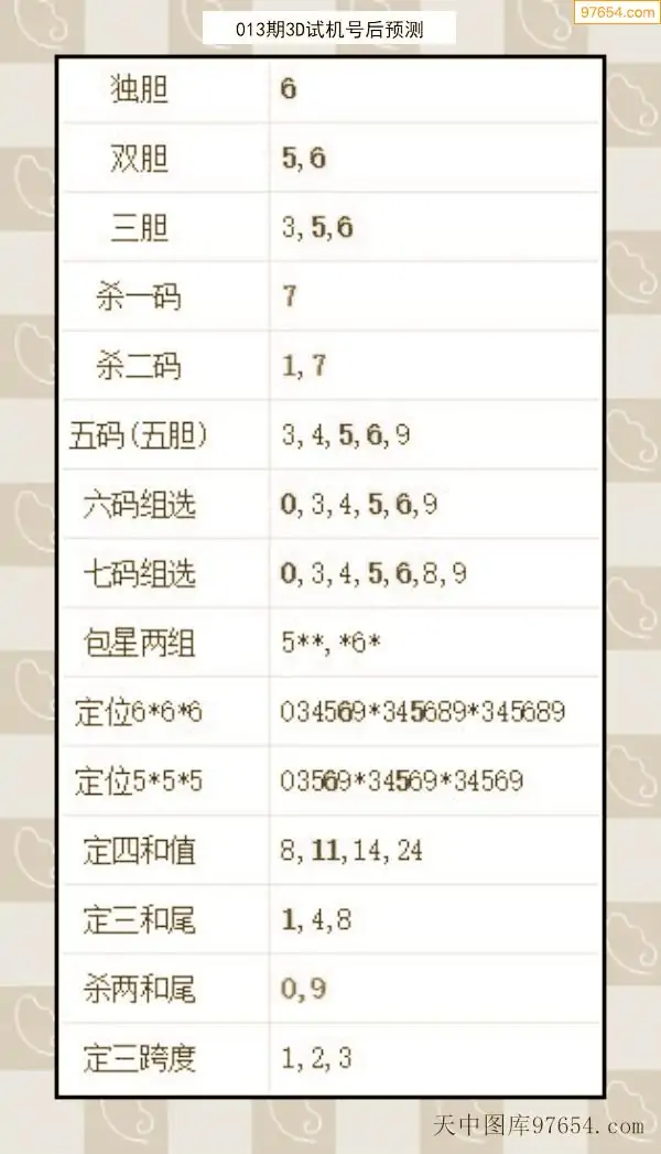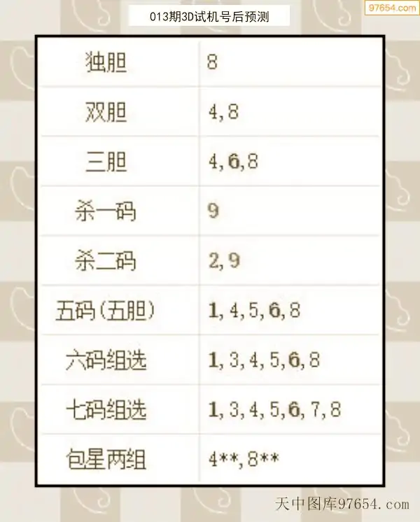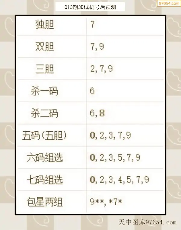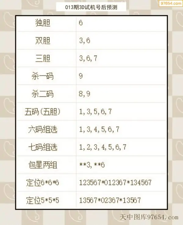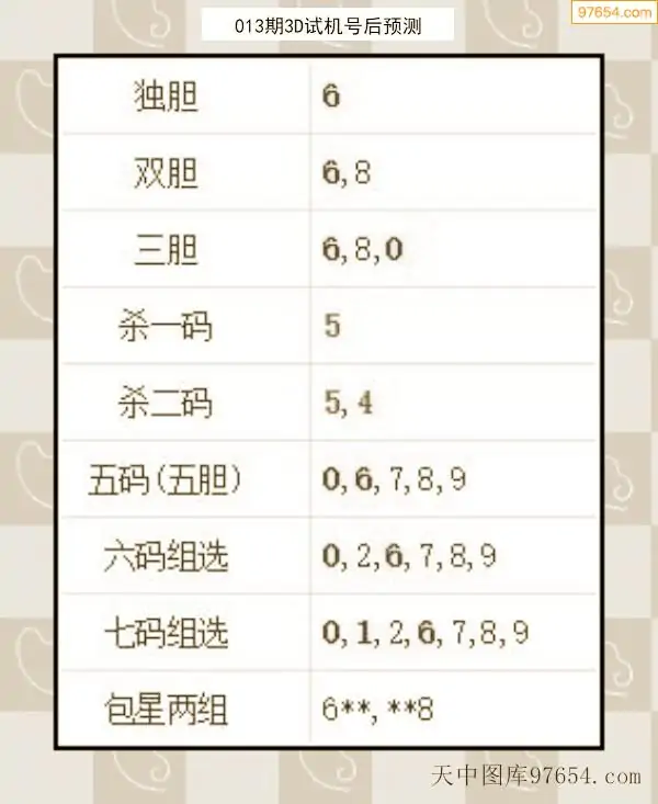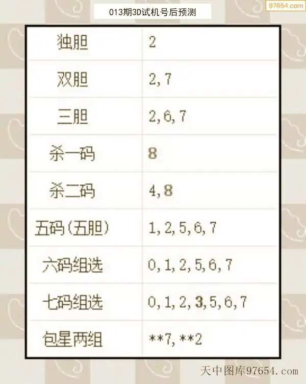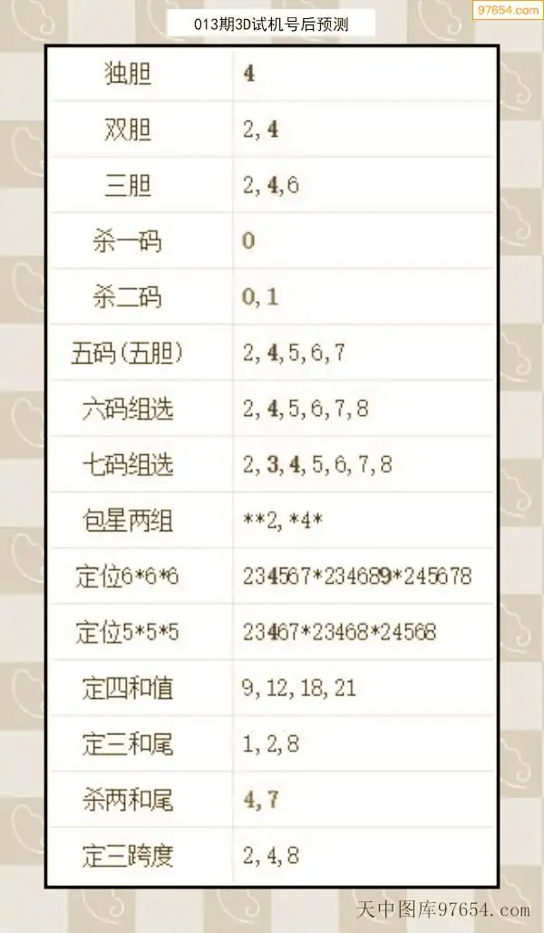 26年012期天中图库专家3D试机号后分析汇总