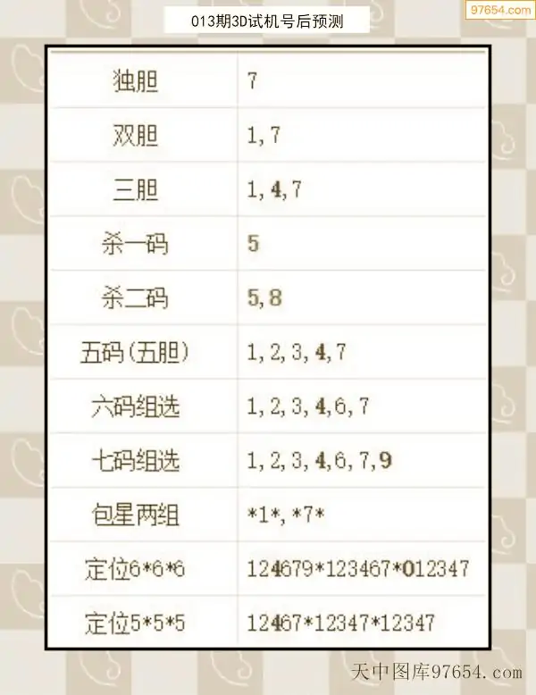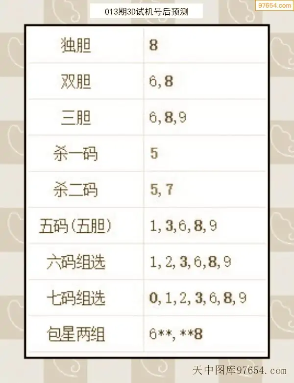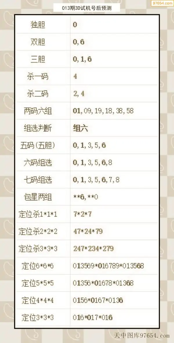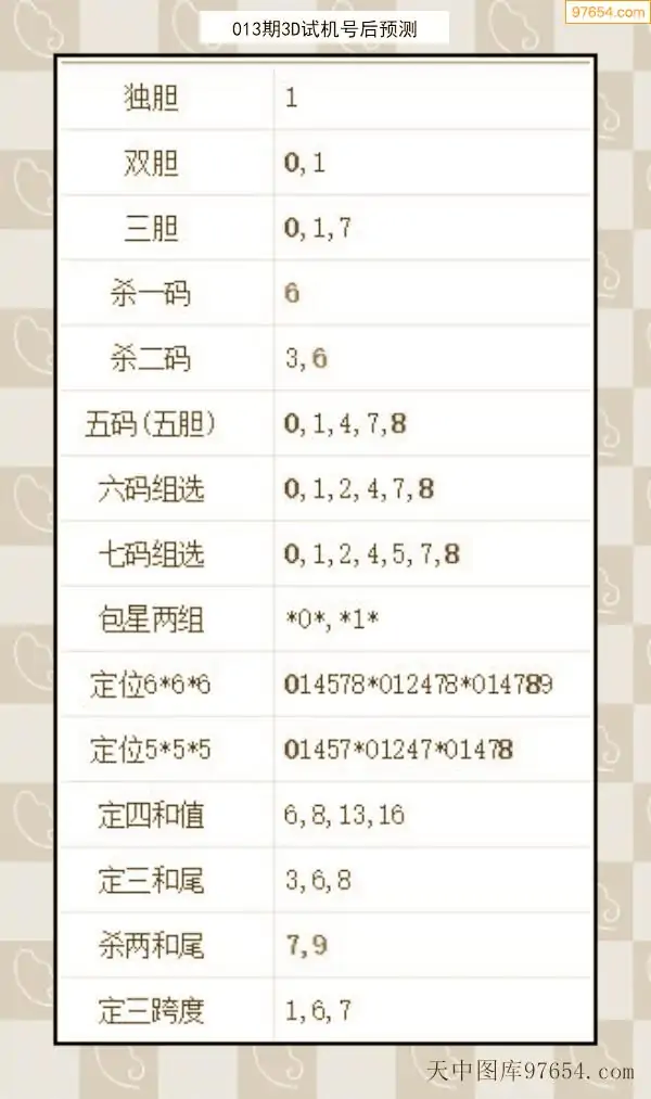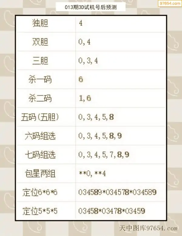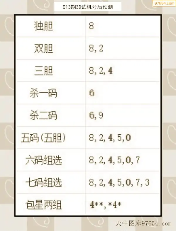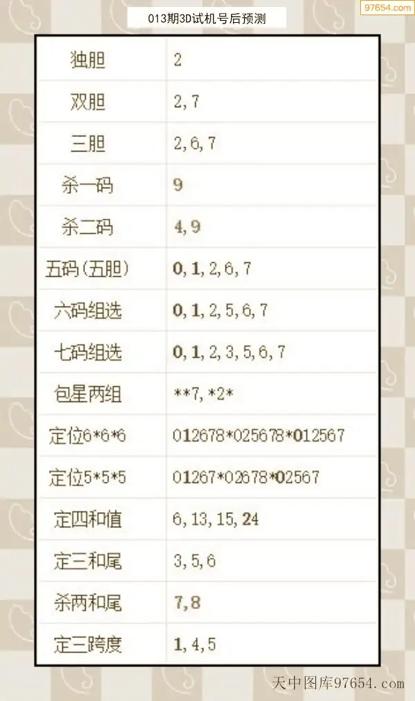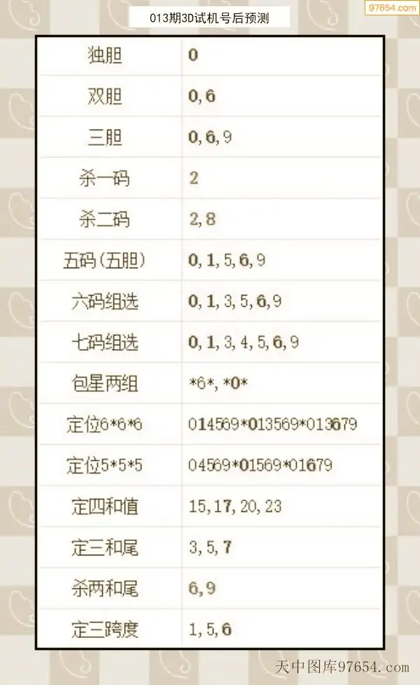 26年012期天中图库专家3D试机号后分析汇总