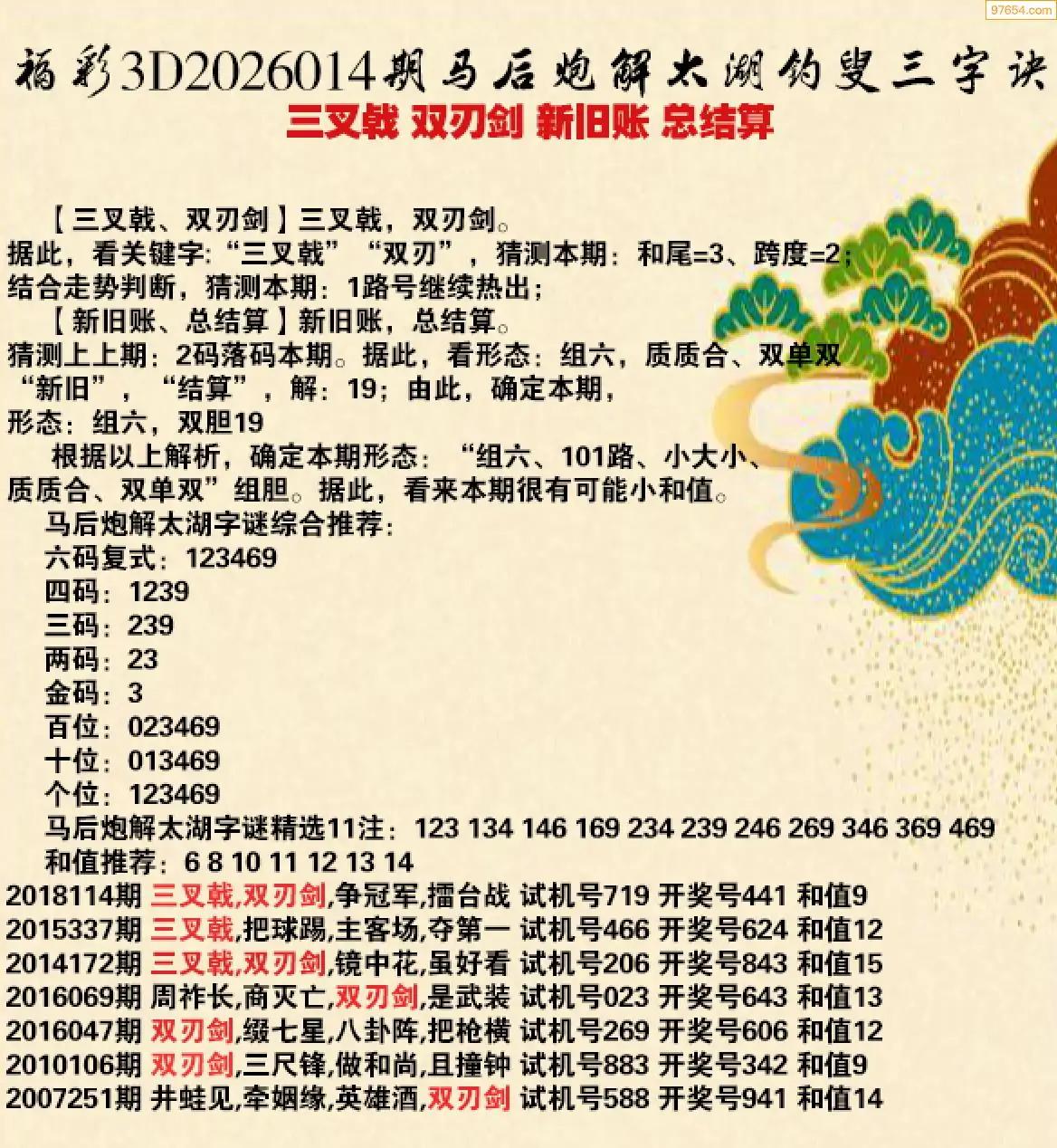 26年014期马后炮解3d太湖钓叟之 三叉戟